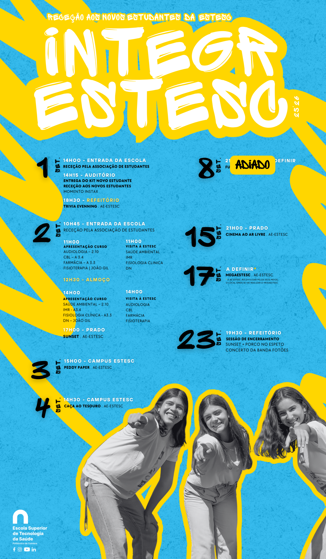 Ainda procurando promover a integração dos novos estudantes, nas semanas seguintes serão, igualmente, dinamizadas atividades pela Associação de Estudantes da ESTeSC (previstas para os dias 15, 17 E 23 de setembro).